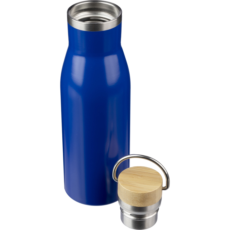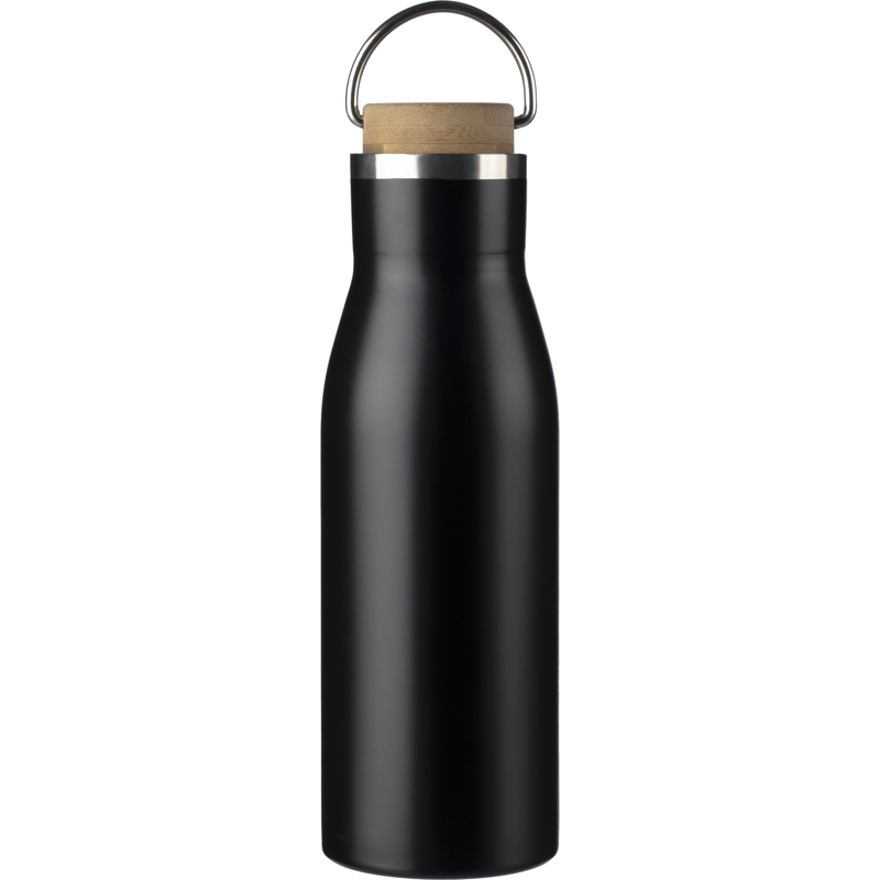 Recycled stainless steel drinking bottle (500 ml) with a bamboo inlayed lid and carrying loop. Includes recycled stainless steel logo on the bottle. Packaged in a brown carton box.
